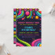 A vibrant and playful birthday invitation featuring a psychedelic, retro-inspired design. The dark background is decorated with colourful, swirling shapes, abstract lines, and vibrant drips of colour reminiscent of the 1970s. The border is a fun pattern of multicolored smiley faces, with stars and bubbles scattered throughout the design. The text is in a mix of bold and playful fonts, with key details highlighted in bright blue and pink.