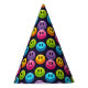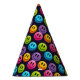 A vibrant and playful birthday invitation featuring a psychedelic, retro-inspired design. The dark background is decorated with colourful, swirling shapes, abstract lines, and vibrant drips of colour reminiscent of the 1970s. The border is a fun pattern of multicolored smiley faces, with stars and bubbles scattered throughout the design. The text is in a mix of bold and playful fonts, with key details highlighted in bright blue and pink.