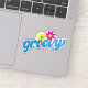 The word Groovy in a groovy retro font with flowers in the vintage pop colours of the 1960s.