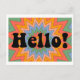 Perfect for Postcrossing, this postcard features a vibrant 1960s inspired background and bold text that says "Hello!" across the front.