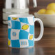 Groovy 70s mug with vibrant distorted chequerboard and lemons design. Featuring a playful pattern of sunny sky blue and crisp white squares, interspersed with fun lemon motifs, this mug is a perfect nod to the kitsch kitchen aesthetic of the era. Its retro charm makes it an ideal addition to your morning coffee ritual or a delightful accent piece of dopamine decor for your home. Enjoy a touch of nostalgic fun with every sip. Mum is editable for short names or initials.