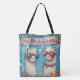 Picture this: You, a fashion-forward woman, strolling through your favourite boutique when her eyes land on the Groovy Llama Squad Tote—and its instant love. The tote bursts with vibrant retro charm, featuring two playful llamas decked out in oversized, pink-rimmed sunglasses and funky red bows and surrounded by a flurry of colourful flowers against a bright turquoise backdrop.