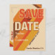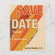 A groovy save the date postcard with the feel of a concert poster. Long shadow text with diagonal stripes in different colours stretches across the card emphasizing the Save the Date message. A unique and really cool first impression for your wedding with retro vibes–when your guests get this post card, they know that fun is ahead. Bold typography. Authentic seventies colours: Burnt orange, reds, and browns. Bold retro typography for a retro seventies feel. The back of the card is orange with striped accents on the corners, a place you can add more information, and a QR code so guests can visit you wedding website.