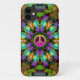 Custom phone cases made with bright psychedelic rainbow colours, geometric patterns centred with a pink and orange peace symbol | art by webgrrl.biz