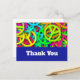 Thank you postcard with a sixties vibe. Cool peace signs in bright and vibrant neon colours featuring all the colours of the rainbow.