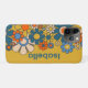 Groovy Retro 60s 70s Flowers Personalised iPhone Case. Fun, cheerful, and whimsical, with a vintage 1960s 1970s vibe. With mustard yellow, orange, and blue tones. Name text can be personalised / customised. By Kierkegaard Design Studio.