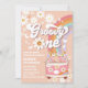 Celebrate your little ones milestone with this groovy retro first birthday invitation! Featuring a pink background with daisies, rainbows, butterflies, and a flower-power van, this playful design brings peace, love, and fun to your party details. Perfect for hippie, boho, or 1960s-inspired themes, this customisable invite sets the tone for a joyful celebration. Guests will love the vibrant colours and nostalgic vibe, making it a standout keepsake for your childs special day.