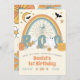 Groovy retro themed Halloween birthday invitation with a rainbow, spooky ghosts, pumpkins, mushrooms and flowers. Perfect for a 70's hippie themed party!