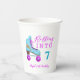 Groovy skating birthday party paper cup featuring illustration of a retro pink and blue roller skate. The text says "rolling into X(age)."