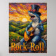 This captivating painting features a "groovy" blue shark, complete with a top hat and red sunglasses, engaged in a "golden hour jam" on an electric guitar. It stands on a rocky outcrop, overlooking a landscape of green hills and trees under a stunning, textured sunset sky. The vibrant, impasto technique creates a lively and exhilarating atmosphere, perfectly conveying the "ROCK and ROLL" vibe.