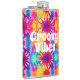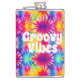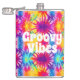 Cool hip flask design featuring a colourful retro tie dye background with customisable hippie "groovy vibes" text.