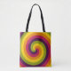 This image is a vibrant, psychedelic spiral design made up of thick, colourful bands that swirl from the centre outward. The colours—yellow, orange, magenta, green, and dark purple—alternate in a repeating, hypnotic pattern, evoking a retro or pop-art aesthetic. The strong contrast and symmetry create a feeling of energy and movement, making it visually striking