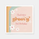 These groovy girl's 3rd birthday party napkins feature a fun 70's style design. The design is adorned with boho colours, white daisies and a retro 70s style font. Personalise the name and age for any child.