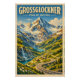 Travel poster featuring Grossglockner, Austria, in a classic retro travel-poster style. Central focus on Austria’s highest peak rising above sweeping alpine valleys, glaciers, and winding mountain roads of the Hohe Tauern range. Soft sunlight illuminates icy summits and green meadows, creating a grand, adventurous alpine atmosphere. Cool, elegant color palette of glacier white, alpine blue, meadow green, and warm golden light. Clean graphic illustration with subtle vintage grain texture. Bold vintage typography headline: “GROSSGLOCKNER – PEAK OF AUSTRIA”. Vertical 2:3 layout, high-resolution, print-ready.