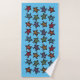 This set of bath towels that includes a wash towel, hand towel, and bath towel are blue each with a group of abstract black turtles with colourful markings on their shells in green, yellow, orange, purple, and red. Purchase the whole set or individually.