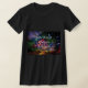 This woman's T-shirt is black. It has a colourful front panel, featuring a road in the distance (which symbolises the future), and a multi-coloured butterfly (which symbolises how our experiences can transform us) - along with the motivational words - Grow through what you go through.
