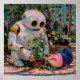Children and a playful robot share in planting flowers, showing a hopeful world where nurturing becomes a shared mission between generations and machines.