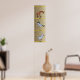 Dolls mark growth of child. Duck for 1-2 feet, Unicorn for 2-3 feet and giraffe from 4 to 5 feet. Measure child's growth against beige textured background. Yellow lines at 2 feet (measure from floor), 3, 4, and 5 feet. Inches marked between lines as 1,2,3,4,5,6,7,8,9,0,1,2 (on yellow line).