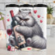 This humourous image features a fluffy, grumpy grey cat with piercing orange eyes, tightly hugging a bottle of wine with a "Happy Valentine's Day" label. A wine glass, a red rose, and floating hearts surround the cat, creating a funny and sarcastic take on a Valentine's Day celebration, emphasizing the cat's apparent preference for wine over romance.