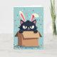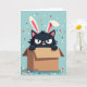 This card shows a dark-furred cat peeking out of a plain cardboard box, its narrowed eyes and downturned mouth giving it a stubborn, funny glare. On its head sit long bunny ears, creamy white with soft pink centers, making the cat look like it’s been talked into joining the celebration 🐰. The cat is centered on the front, so its grumpy face becomes the main focus, yet the costume adds a sweet, friendly twist as if someone nearby is teasing it with affection. Behind it, a light blue background is sprinkled with small round dots in reds, oranges, whites, and cool blues, like confetti drifting through the air 🌷. Some of the dots gather near the bottom edge around the box, hinting at a party mess that’s still settling. A short Easter greeting appears near the top in a simple, easy-to-read style, set in a darker contrasting color against the blue. The box is drawn with light brown panels and crisp edges, with the cat’s ears rising above the rim and the scattered dots floating all around.