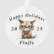 A cute grumpy cat with the funny and sarcasticly "happy holidays" with this year, name and on the back "always grumpy". Cute watercolor illustration of this angry cat with a cute red bow.