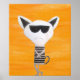 An original art hipster trendy and grungy illustration in black ink pen of a cartoon grumpy cool cat with sunglasses and stripey suit against orange background. Arty and original design by Samson Tuong.