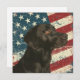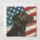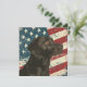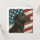 A watercolor portrait of a beautiful black Labrador Retriever Dog is placed against a grunge background of the USA flag. The back of this all occasion flat card has a text field for you to customize.