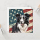 A watercolor portrait of a beautiful Border Collie Dog is placed against a grunge background of the USA flag. The back of this all occasion flat card has a text field for you to customize.
