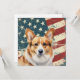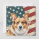 A watercolor portrait of a beautiful Corgi Dog is placed against a grunge background of the USA flag. The back of this all occasion flat card has a text field for you to customize.