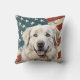 A beautiful watercolor portrait of a Great Pyrenees Dog is placed against a grunge background of the USA flag. Both sides of the pillow have the same image.