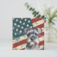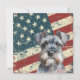 A watercolor portrait of a beautiful Miniature Schnauzer Terrier Dog is placed against a grunge background of the USA flag. The back of this all occasion flat card has a text field for you to customize.