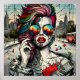 Unique ai art depicting a beautiful modern woman with pink and blue hair, sunglasses with a reflection of the city, urban background post-apocalyptic vibes.
