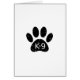 A cute cartoon style dog paw print and text with grunge and distressed effect applied to image. Custom cards with K9 theme. Gift idea.