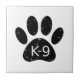 A cute cartoon style dog paw print and text with grunge and distressed effect applied to image. Custom ceramic tiles with K9 theme. Gift idea.
