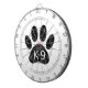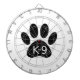 A cute cartoon style dog paw print and text with grunge and distressed effect applied to image. Custom dartboards with K9 theme. Gift idea.