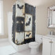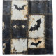 Distressed denim Halloween pattern shower curtain with bats, skulls, and dark heart designs on a black and cream grid. Gothic, grunge, and eerie aesthetic—ideal for spooky décor, alternative gifts, and Halloween party style.