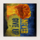 Edgy Ukraine support puzzle with grunged Ukraine flag, flaming fist and "Never Give Up" in distressed fonts.
