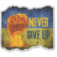 Edgy Ukraine support laptop vinyl sticker with grunged Ukraine flag, flaming fist and "Never Give Up" in distressed fonts.