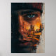 Experience raw urban edge with this striking double exposure portrait. A young man gazes directly ahead, his expression intense and focused. A gritty city skyline is artfully overlaid onto his cheek, highlighted by a vibrant yellow/orange glow that radiates from behind the buildings. The overall design possesses a distinct grungy feel, capturing the unfiltered energy and texture of the streets. Perfect for those who appreciate edgy contemporary art, bold urban aesthetics, and portraits with a strong, direct impact.