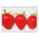 Drei rote, süsse Erdbeeren auf weissem Hintergrund sind auf dieser Grusskarte zu sehen.