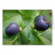 Zwei hübsche, wildwachsende Waldheidelbeeren, die rechte mit Wasser überzogen, vor grünem Blatthintergrund sind auf dieser Grusskarte zu sehen. Die Karte ist blanko.