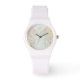 A white light guardian angel holds a heart and is surrounded by rainbow hearts at the angel's feet. A golden yellow halo is over the angel's head. The feathers on the angel's wings form into hearts. Painting was rendered with watercolor pencil on paper. Make customised guardian angel watch designs with your personal messages and/or photos. Use the "customise it" button. The guardian angel art makes great personalised custom wrist watch gifts!
