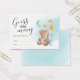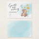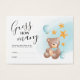 A boy teddy bear baby shower game featuring a simple plain white background, a watercolor bear, blue balloon, gold stars & a babies bottle, and a "guess how many" template that is easy to personalise.