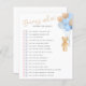 Celebrate the mum-to-be with this cute and simple modern baby shower "Guess Who" baby shower game card featuring a watercolor drawing of a cute teddy bear with tan, blue and grey balloons.