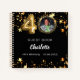 A stylish black background with faux gold stars. Add your photo, name, and text. Age number is written with a balloon style font.