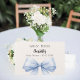 A beige, cream background colour. Decorated with a large light blue bow. Personalise and add the name and date.