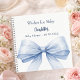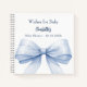 A white background colour. Decorated with a large light blue bow. Personalise and add the name and date. Title: Wishes for Baby.