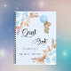 For an elegant and modern baby shower. A light blue background. Decorated with light blue, florals, pampas grass and a teddy bear holding a balloon.