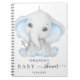 A baby shower guest book celebrating a baby boy. A stylish white background with a cute elephant boy in blue. Add a name and a date.
