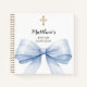 A white background colour. Decorated with a large blue bow and a golden cross. Personalise and add the name and date.